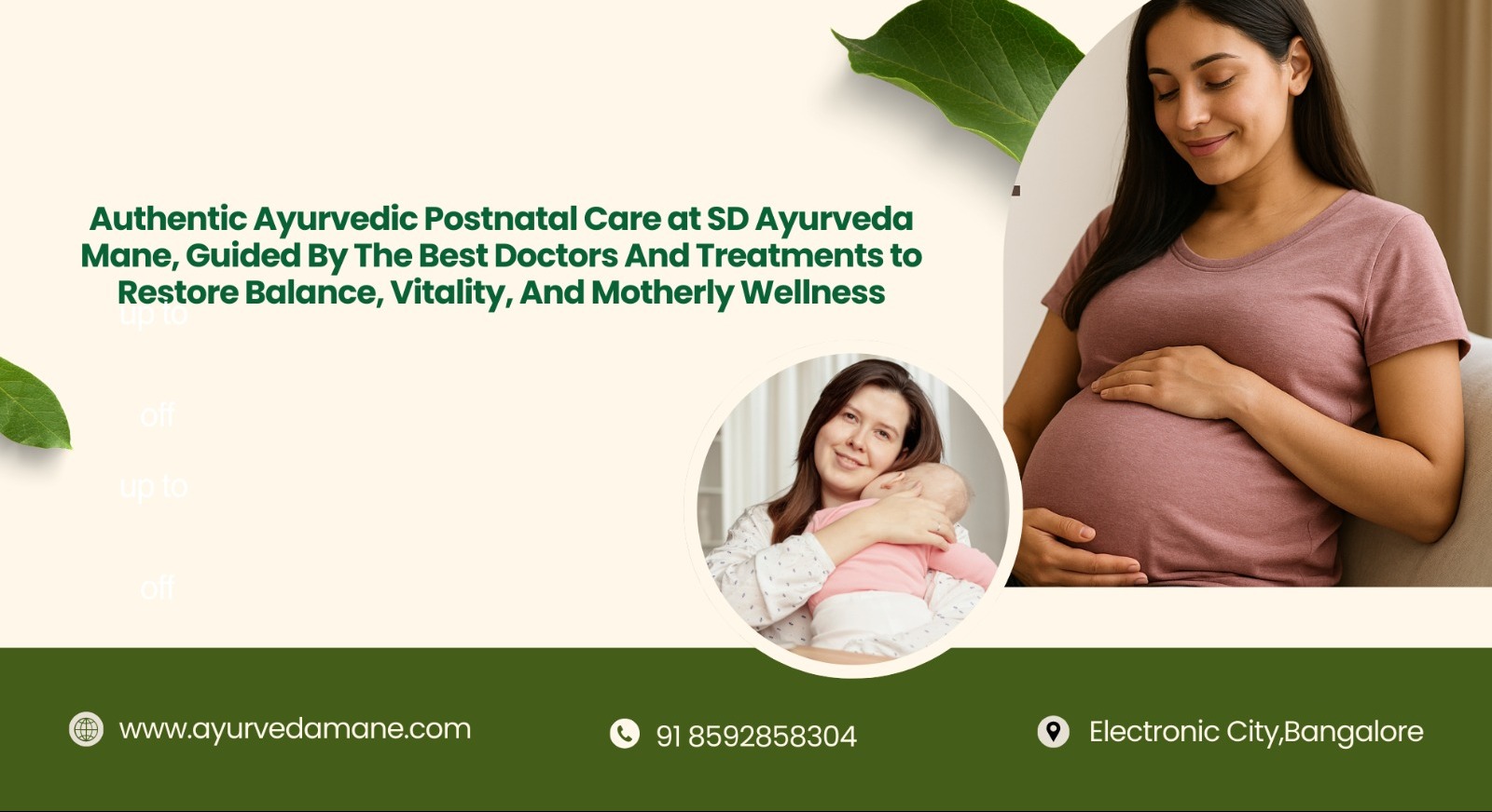 SD Ayurvedic Postnatal Care is a trusted postnatal care centre with stay in Electronic City, Bangalore, offering holistic postnatal care and postpartum care designed for complete mother’s recovery after childbirth. Our expert doctors and trained therapists provide authentic Ayurvedic postnatal care and personalized postpartum recovery care, focusing on physical healing, hormonal balance, emotional wellbeing, and strength rebuilding. We specialize in postnatal mother care and after delivery care for mother, including traditional postpartum massage therapy, medicated oil treatments, and guided therapies for faster recovery. Our comprehensive postpartum care package includes postnatal care with accommodation and nourishing Ayurvedic postnatal care with food, ensuring a safe, comfortable, and rejuvenating healing environment for new mothers seeking complete care under one roof.
